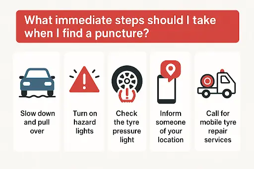 Once you feel like your tyre is punctured, the first thing to do is to ensure your safety. Additionally, you must take the following immediate steps: