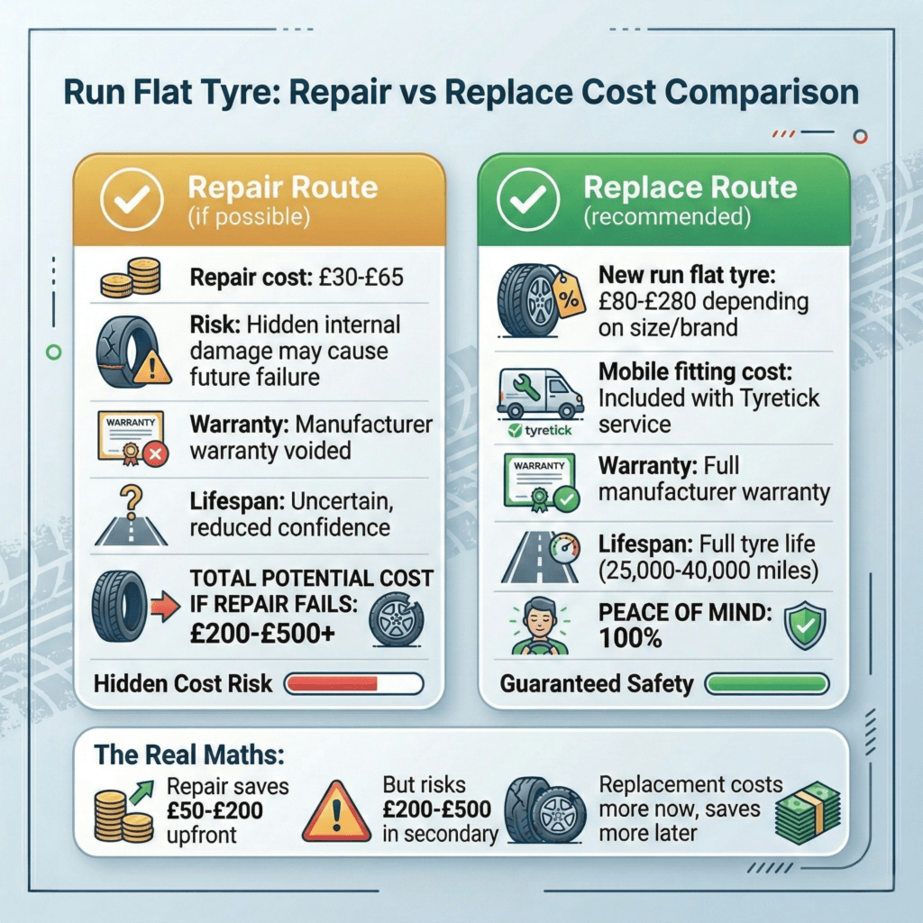 If repair is possible (and it rarely is), expect £30-£65 depending on the service provider. Mobile repair costs slightly more due to equipment and travel. However, most run flats end up needing full replacement at £80-£280 per tyre.