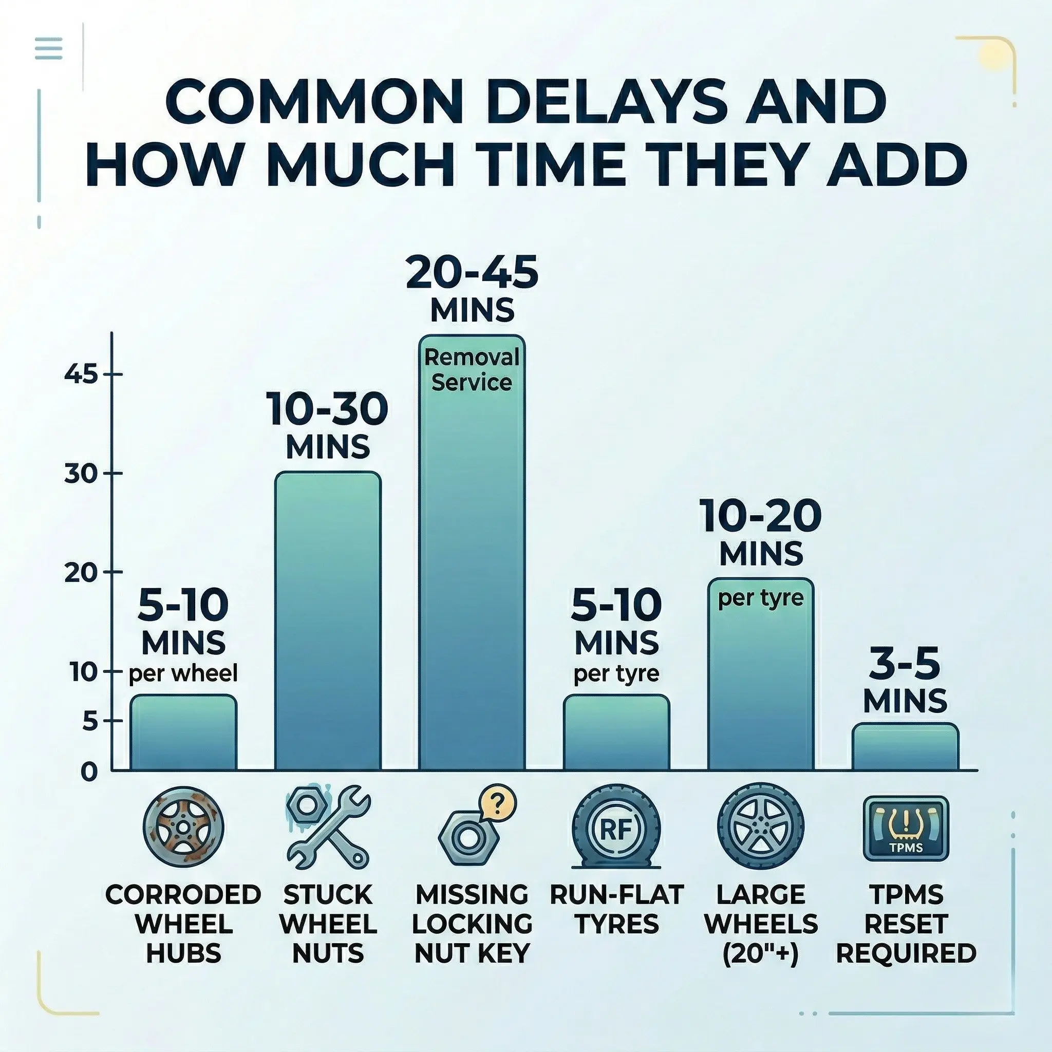 Stuck wheel nuts: Over-tightened or corroded nuts are a nightmare. Sometimes they round off completely. Add 10-30 minutes if problematic.