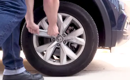 Step 2: Put a wheel chock or heavy object behind a wheel diagonally opposite the punctured one. Use your wheel wrench to turn each lug nut anticlockwise a few turns (preferably 3/4 to 1/2 of a turn) while the tyre is still on the ground. However, don’t remove them fully yet.