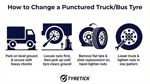 Changing a punctured truck/bus tyre is almost the same as changing a car tyre. You just need heavy equipment, such as a heavy-duty wrench.