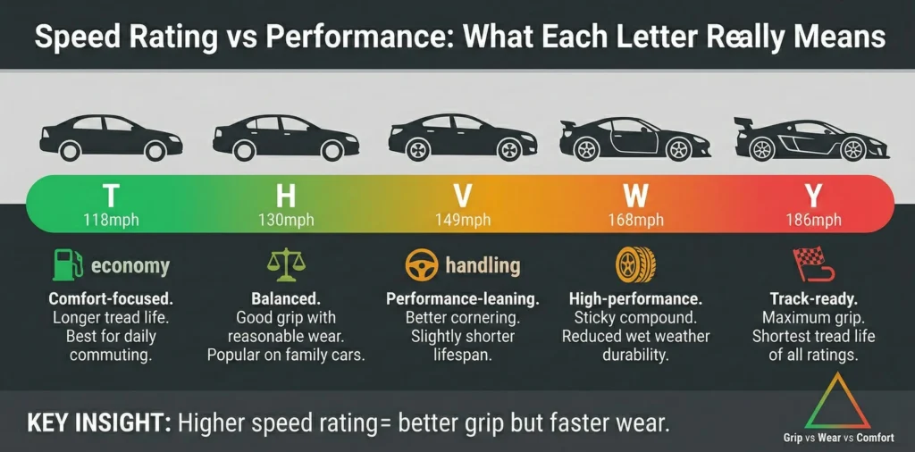 The speed rating is the final letter in your tyre code. It tells you the maximum sustained speed the tyre can handle safely.