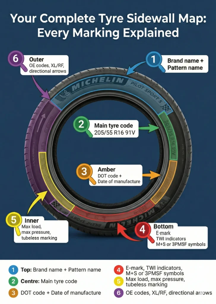 Tyre sidewall markings tell you the width, height, construction, rim size, load capacity and maximum speed of your tyre. Get them wrong when buying replacements? You risk your safety, your insurance, and a £2,500 fine per tyre.