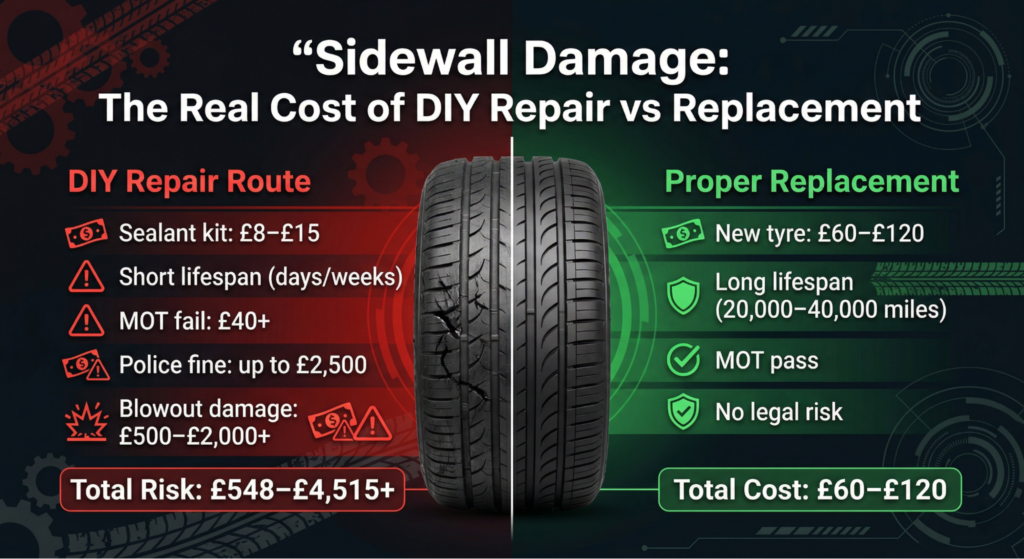 There’s no such thing as a legitimate sidewall puncture repair. Replacement costs £45-£160 depending on tyre brand and size. Mobile fitting costs £60-£120 total, including the tyre and fitting at your location.